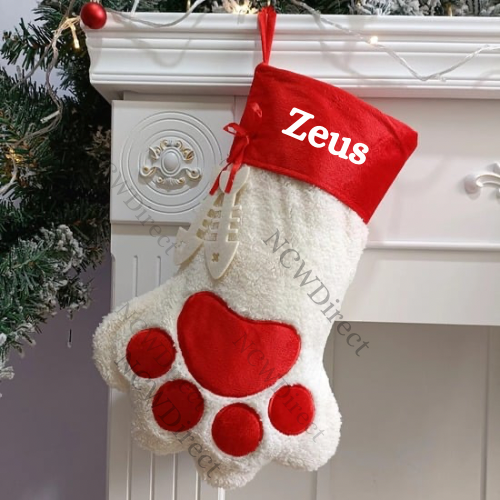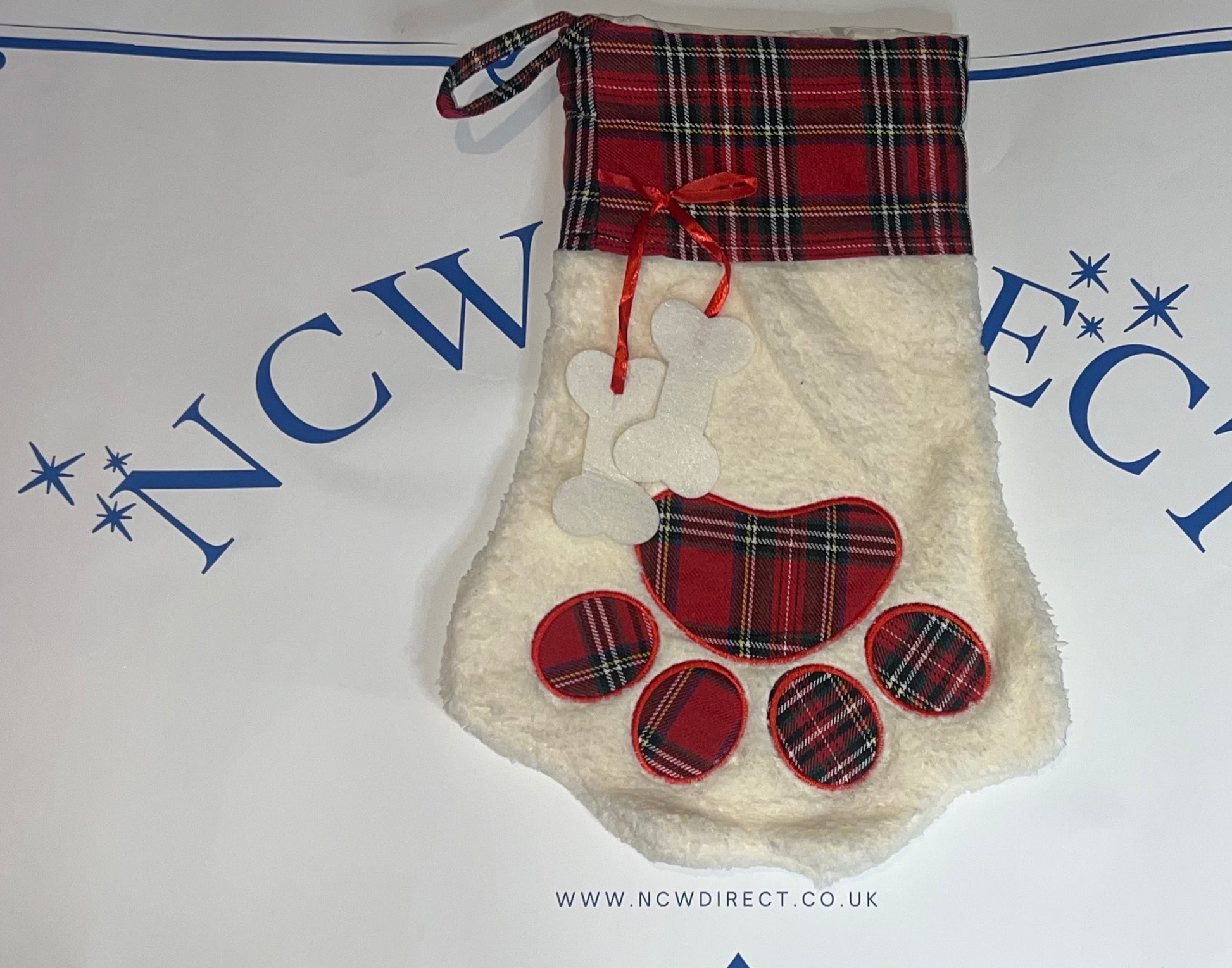 Dog ,Cat Paw, White Faux Sherpa with Red /Green Plaid Cuff Paw Stocking